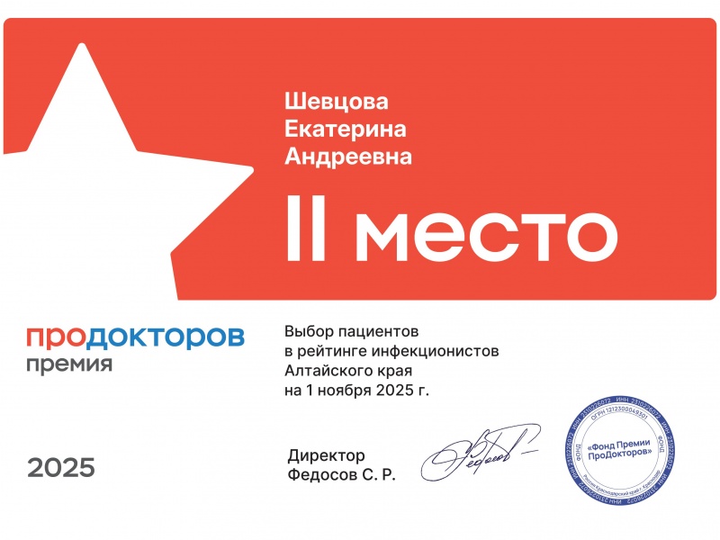 Поздравляем нашего врача Снегиреву Елену Николаевну с 1 местом в рейтинге гинекологов Алтайского края по мнению пациентов на 1 ноября 2025 года!